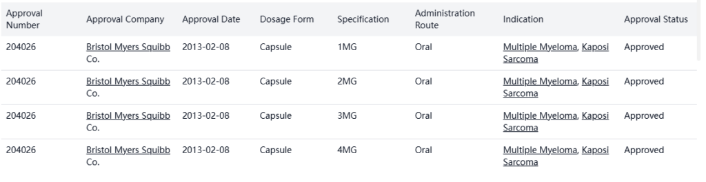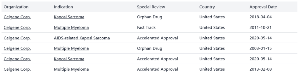 - Orphan Drug Designation for multiple myeloma (granted 2003) and Kaposi sarcoma (granted 2018)