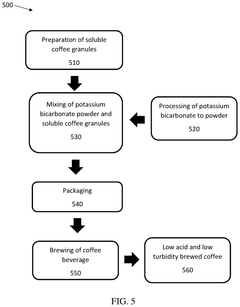 - Incorporating potassium bicarbonate into coffee beans, soluble coffee granules, or brewed coffee to neutralize acidity and reduce turbidity, utilizing its solubility and safety as a GRAS substance to adjust pH and clarity without adverse effects on taste.