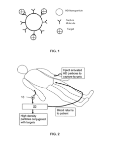 - A laminar flow mixing device and reverse-flow density gradient centrifuge system that uses retrievable nanoparticles functionalized with capture molecules to bind targets in blood, enhancing the separation efficiency by promoting laminar flow and reducing turbulence, allowing for the effective removal of high-density particles and molecules from biological fluids.