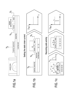 Bioelectronic interfaces that connect neural tissues with electronic devices for biosensing applications. These interfaces enable direct communication between biological neural systems and electronic circuits, allowing for monitoring of neural activity and detection of biomarkers. The technology incorporates specialized electrodes and transducers that can detect electrical signals from neurons and translate them into electronic data for analysis and interpretation.- Neural-electronic interfaces for biosensing: Bioelectronic interfaces that connect neural tissues with electronic devices for biosensing applications. These interfaces enable direct communication between biological neural systems and electronic circuits, allowing for real-time monitoring of neural activity. The technology incorporates specialized electrodes and transducers that can detect and transmit neural signals with high fidelity, providing valuable data for medical diagnostics and neural research.