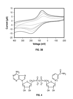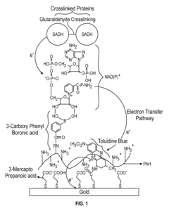 - A biomimetic device with a polyelectrolyte-bound enzyme system that allows reversible binding to a treated substrate electrode, facilitating efficient electron transfer and regeneration by electrostatic attraction, using charged polyelectrolytes like poly(allylamine hydrochloride) and poly(ethyleneimine) to maintain the enzyme, cofactor, and mediator in proper orientation, enabling efficient electron transfer and easy regeneration.