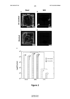 Micro and nano-textured surfaces are engineered to create superhydrophobic coatings with enhanced antibacterial properties. These surfaces combine physical texturing (creating air pockets that increase water contact angles) with chemical antibacterial agents. The hierarchical surface structures minimize bacterial attachment points while incorporated antibacterial compounds provide active protection. This approach mimics natural antibacterial surfaces like lotus leaves and insect wings, creating self-cleaning surfaces that resist both water and bacterial contamination.Expand Specific Solutions
